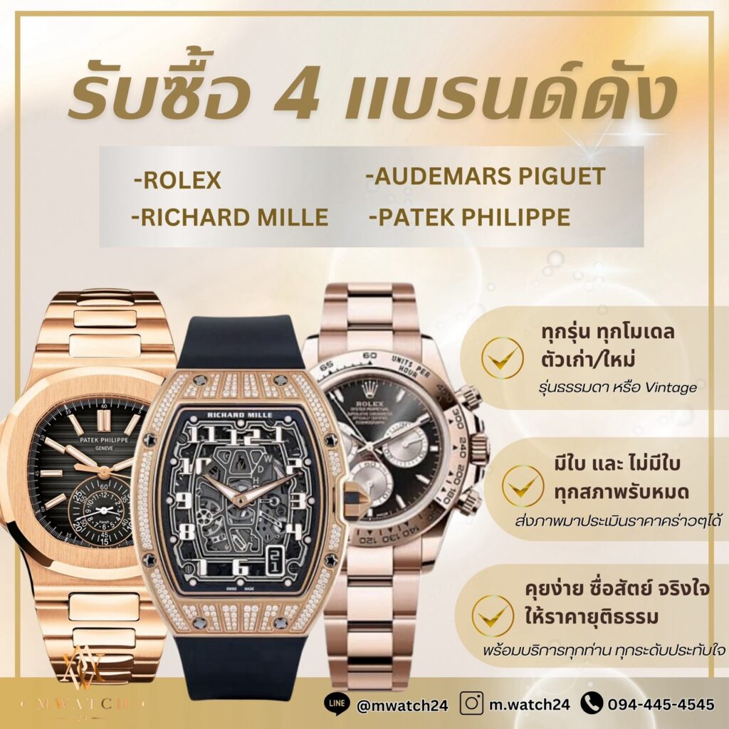 “บริการรับซื้อนาฬิกา Rolex, RICHARD MILLE, Patek, AP และแบรนด์หรูอื่น ๆ โดยทีมผู้เชี่ยวชาญมืออาชีพ ตรวจเช็คแท้ทุกเรือน จ่ายสดภายใน 10 นาที”
